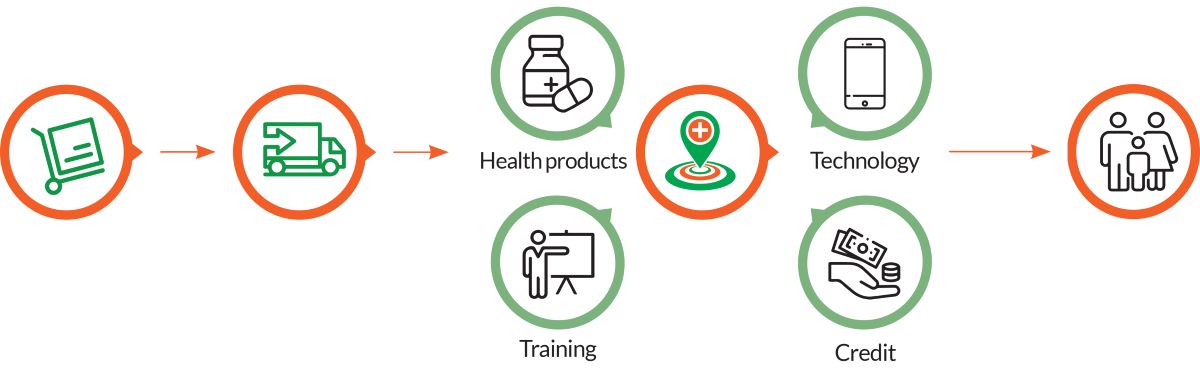3: CHWs receive a starter kit with high-quality health products covering personal care, nutrition, family planning, and basic medicine. They are supported with coaching, refresher courses, regular product restocking, and access to credit.